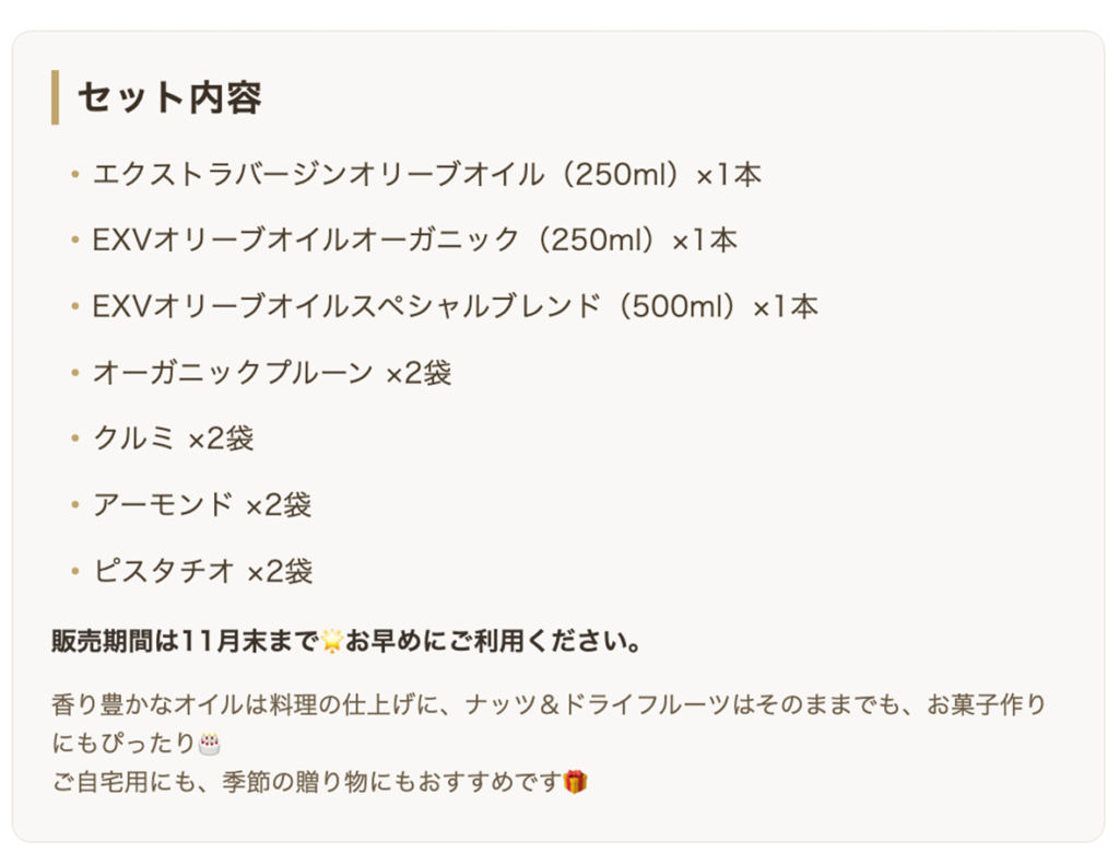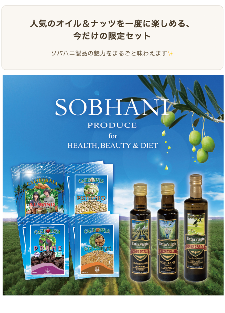 受信メール設定のお願い SOBHANI製品いろいろ詰め合せセット 15,000円(税込)入荷待ち予約受付中 セット内容 ・エクストラバージンオリーブオイル(250ml)×1本 ・EXVオリーブオイルオーガニック(250ml)×1本 ・EXVオリーブオイルスペシャルブレンド(500ml)×1本 ・オーガニックプルーン ×2袋 ・クルミ ×2袋 ・アーモンド ×2袋 ・ピスタチオ ×2袋 販売期間:11月末まで 購入数: 予約販売について クーポンコードの利用方法 特定商取引法に基づく表記(返品等) この商品について問い合わせる 買い物を続ける ツイート ページトップへ戻る△